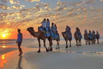 Broome is a beach resort town in Western Australia’s Kimberley region. Along its Indian Ocean coastline, the white sands of 22km-long Cable Beach offer a dramatic backdrop for sunset camel rides.